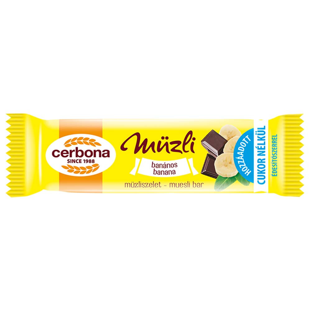Megnevezés: Cerbona banános müzliszelet kakaós tejbevonó talppal, cukor hozzáadása nélkül, édesítőszerekkel 20 g