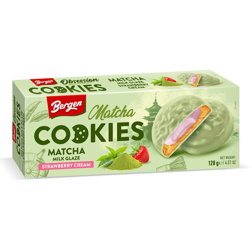 Bergen keksz eper ízű tejes krémmel töltve, matchás tejbevonattal - 128g